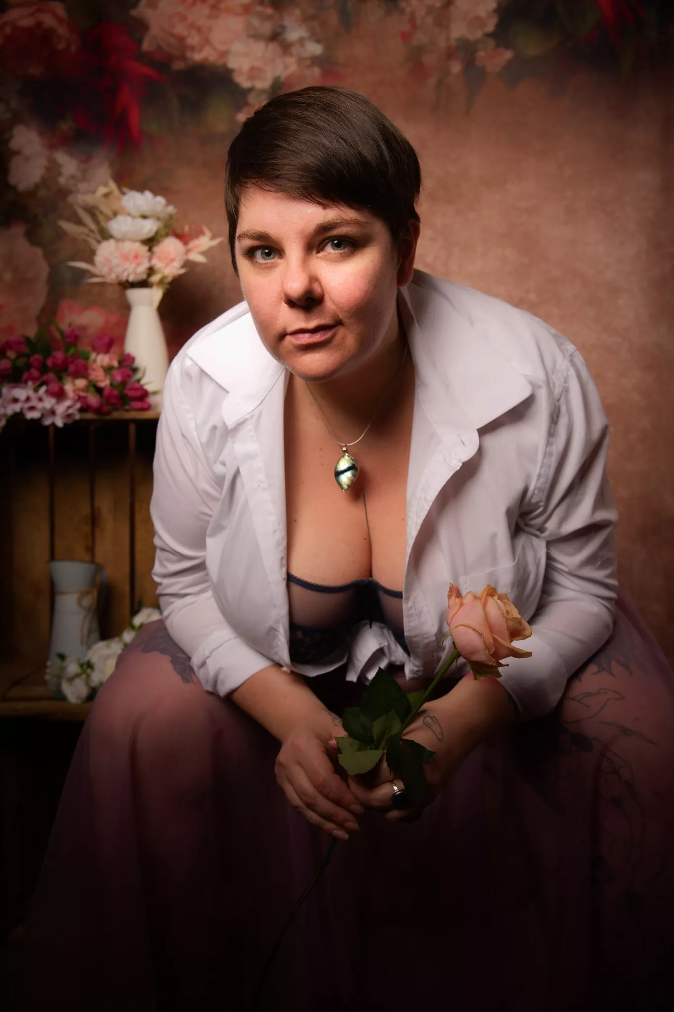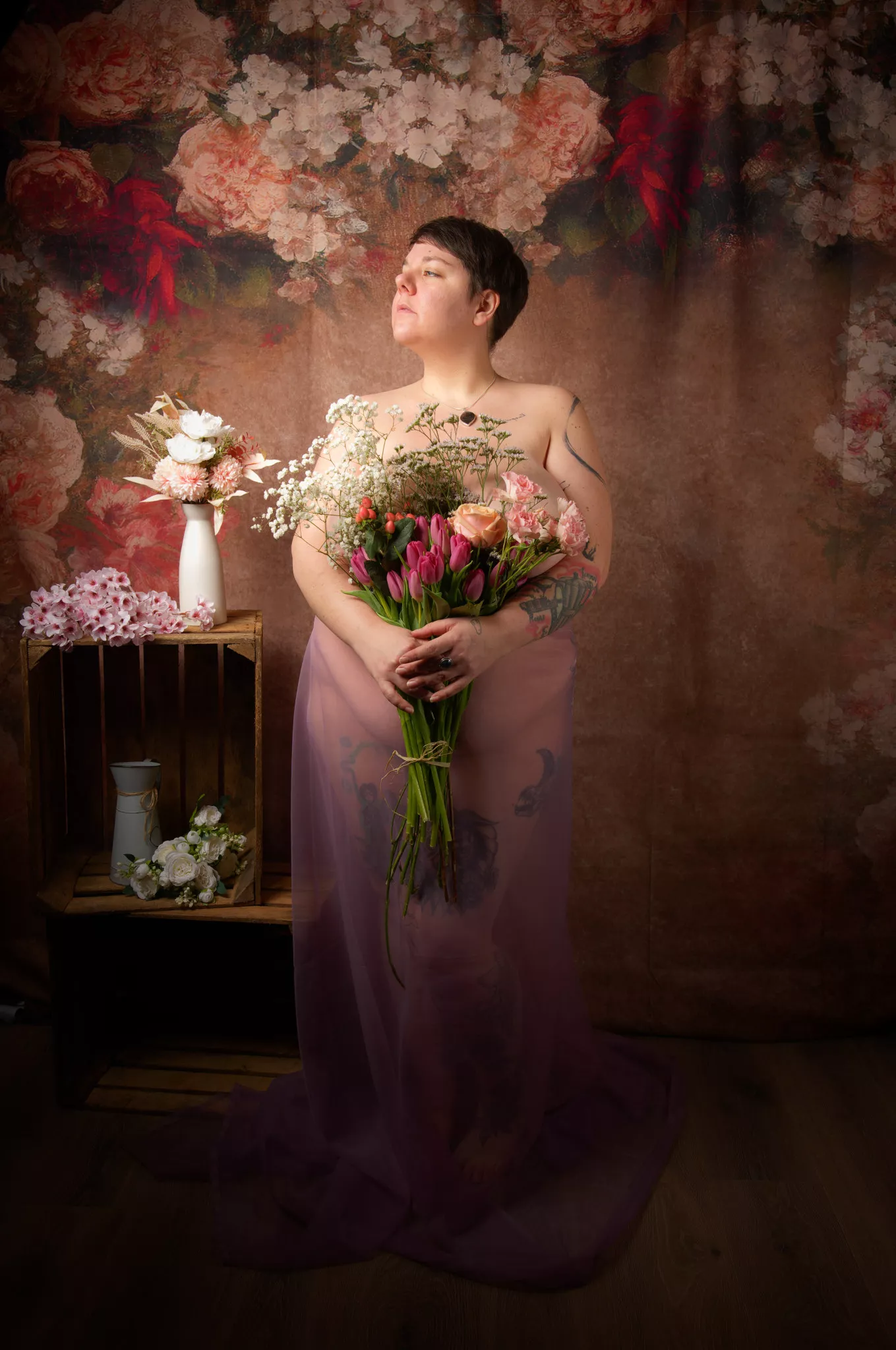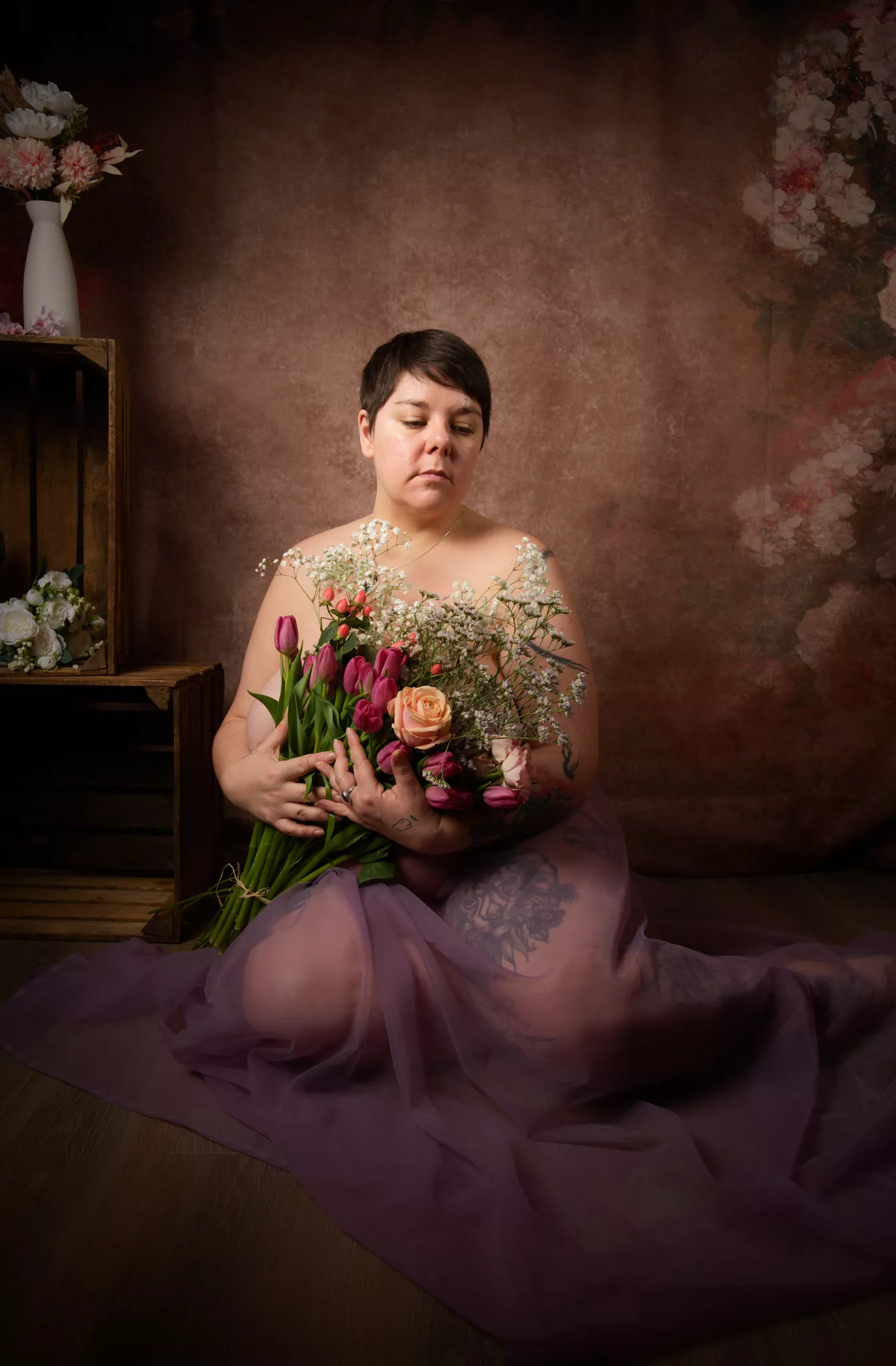 Ici, le décor emprunte aux portraits classiques : fleurs, lumière douce, pose solennelle. Mais le corps ne se plie pas aux conventions. Il ne cherche ni à se rendre plus acceptable, ni à se faire plus petit.